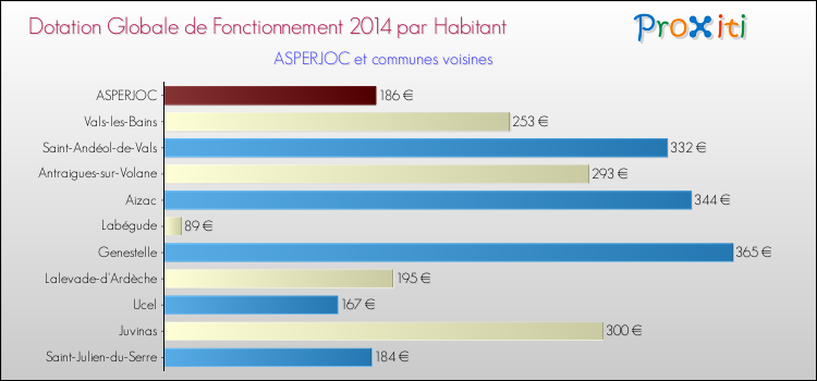 Le graphique ci dessous indique la Dotation Globale de Fonctionnement accordée par habitant à Asperjoc en 2014 par rapport aux communes voisines.