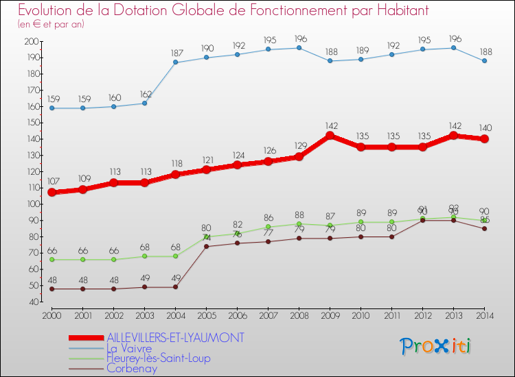 Dans le même temps, la Dotation Globale de Fonctionnement accordée aux communes françaises similaires à Aillevillers-et-Lyaumont était de 171 € par habitant, en 2014.