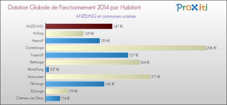 Le graphique ci dessous indique la Dotation Globale de Fonctionnement accordée par habitant à Anzeling en 2014 par rapport aux communes voisines.