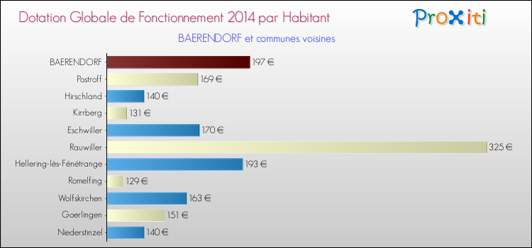 Le graphique ci dessous indique la Dotation Globale de Fonctionnement accordée par habitant à Baerendorf en 2014 par rapport aux communes voisines.