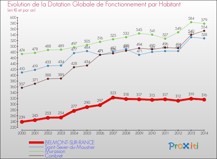 Rapporté aux 1 007 habitants de Belmont-sur-Rance en 2014, cela représente 316 € par habitant (en baisse de 0.94 % par rapport à 2013).