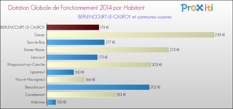 Le graphique ci dessous indique la Dotation Globale de Fonctionnement accordée par habitant à Berlencourt-le-Cauroy en 2014 par rapport aux communes voisines.