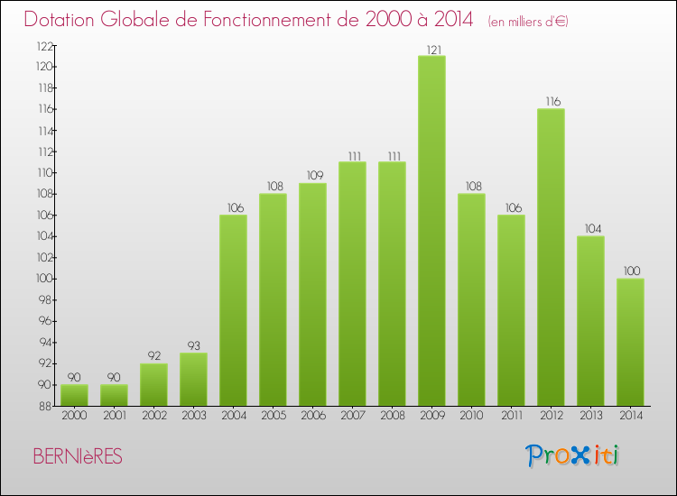 Dans le même temps, la Dotation Globale de Fonctionnement accordée aux communes françaises similaires à Bernières était de 171 € par habitant, en 2014.
