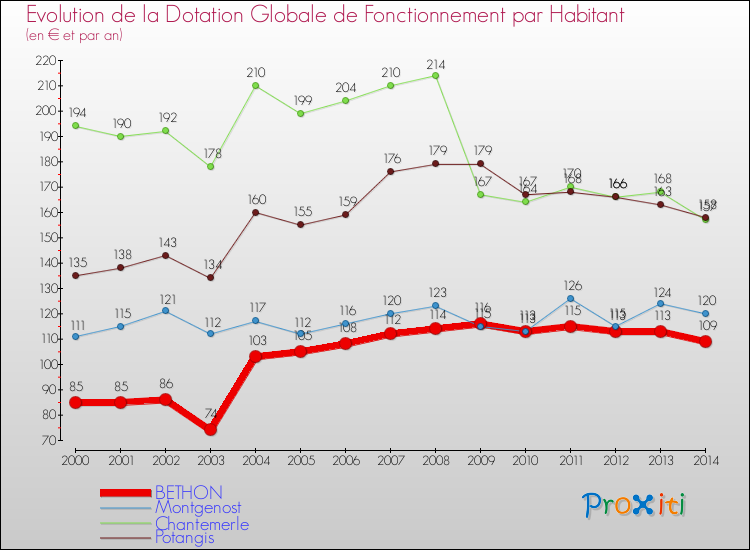 Dans le même temps, la Dotation Globale de Fonctionnement accordée aux communes françaises similaires à Bethon était de 199 € par habitant, en 2014.