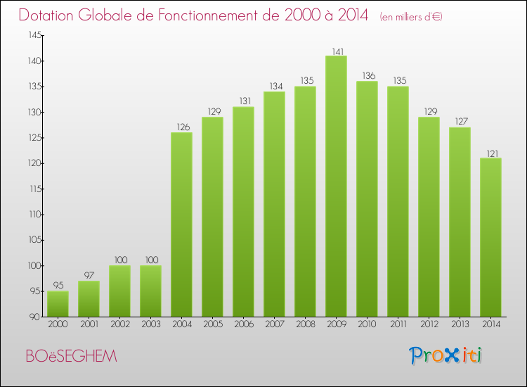 Dans le même temps, la Dotation Globale de Fonctionnement accordée aux communes françaises similaires à Boëseghem était de 171 € par habitant, en 2014.
