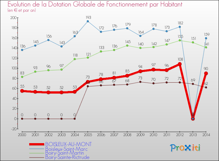 Le graphique ci dessous indique la Dotation Globale de Fonctionnement accordée par habitant à Boisleux-au-Mont en 2014 par rapport aux communes voisines.