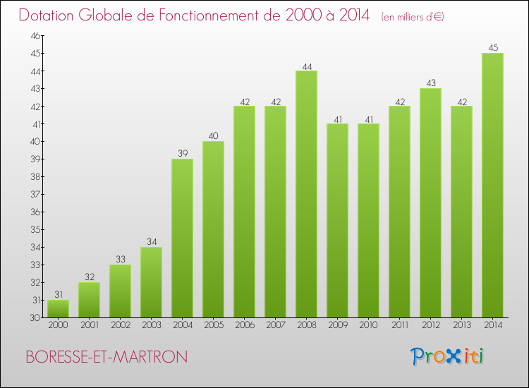 En effet, la dotation globale de fonctionnement versée par l'état en 2014 à la seule commune de Boresse-et-Martron était de : 45 000 € au total.
