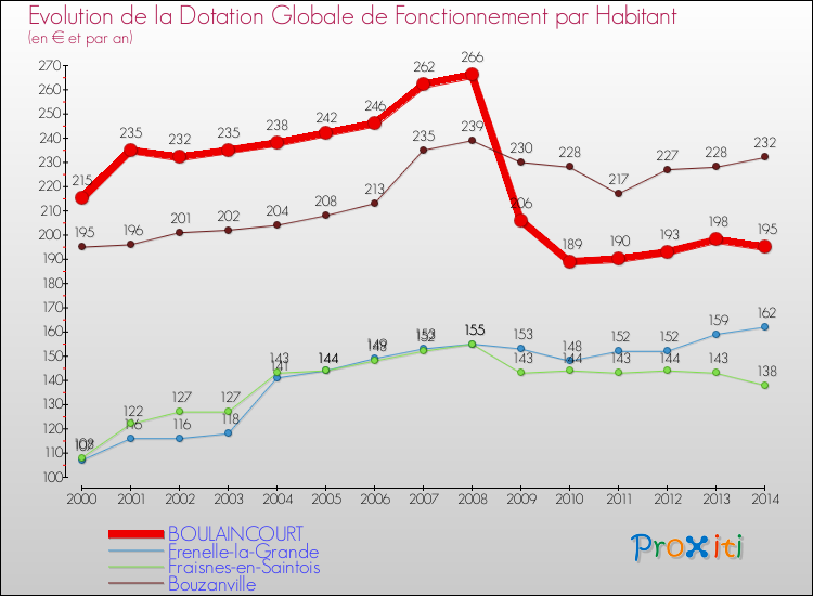 Dans le même temps, la Dotation Globale de Fonctionnement accordée aux communes françaises similaires à Boulaincourt était de 230 € par habitant, en 2014.