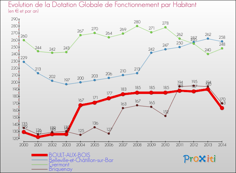 Dans le même temps, la Dotation Globale de Fonctionnement accordée aux communes françaises similaires à Boult-aux-Bois était de 226 € par habitant, en 2014.