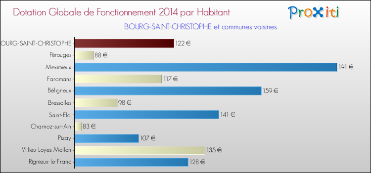 Le graphique ci dessous indique la Dotation Globale de Fonctionnement accordée par habitant à Bourg-Saint-Christophe en 2014 par rapport aux communes voisines.