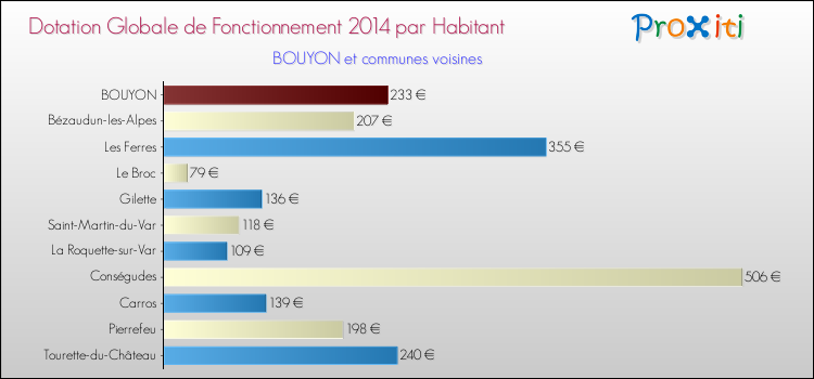 Le graphique ci dessous indique la Dotation Globale de Fonctionnement accordée par habitant à Bouyon en 2014 par rapport aux communes voisines.