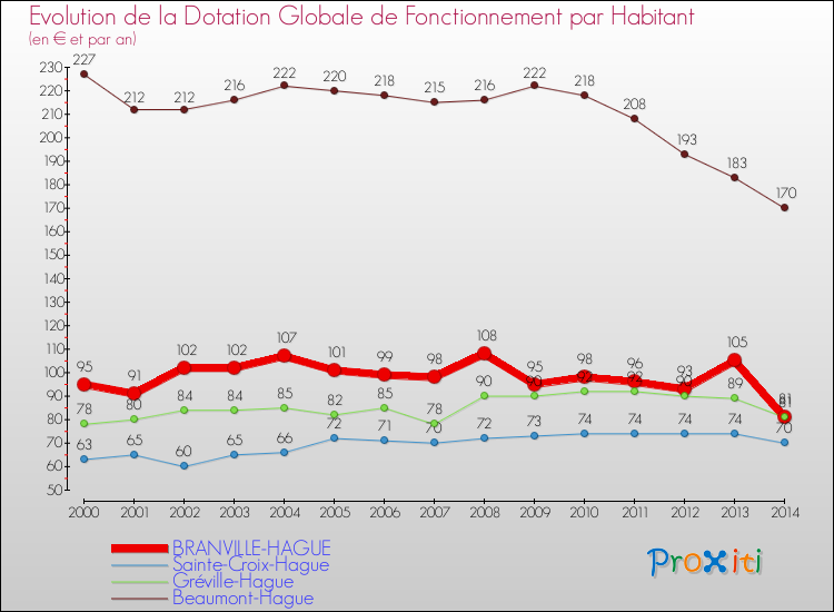 Dans le même temps, la Dotation Globale de Fonctionnement accordée aux communes françaises similaires à Branville-Hague était de 226 € par habitant, en 2014.
