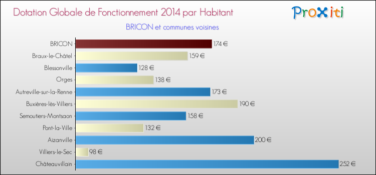 Le graphique ci dessous indique la Dotation Globale de Fonctionnement accordée par habitant à Bricon en 2014 par rapport aux communes voisines.