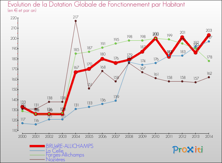 Le graphique ci dessous indique la Dotation Globale de Fonctionnement accordée par habitant à Bruère-Allichamps en 2014 par rapport aux communes voisines.