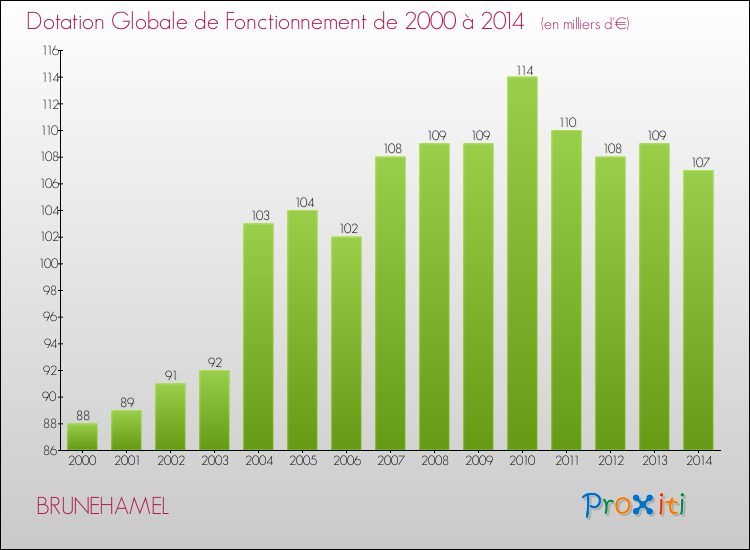 Dans le même temps, la Dotation Globale de Fonctionnement accordée aux communes françaises similaires à Brunehamel était de 171 € par habitant, en 2014.