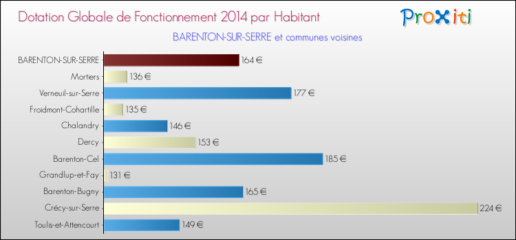 Le graphique ci dessous indique la Dotation Globale de Fonctionnement accordée par habitant à Barenton-sur-Serre en 2014 par rapport aux communes voisines.