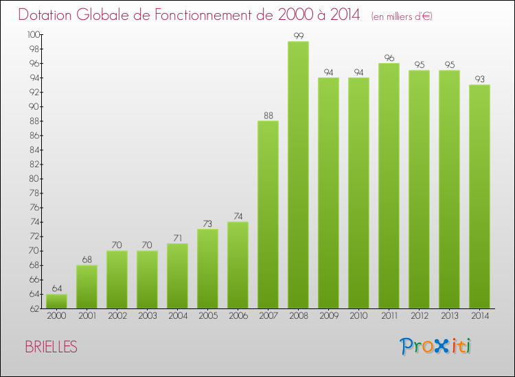 Dans le même temps, la Dotation Globale de Fonctionnement accordée aux communes françaises similaires à Brielles était de 171 € par habitant, en 2014.