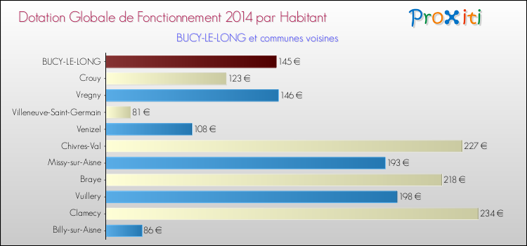 Le graphique ci dessous indique la Dotation Globale de Fonctionnement accordée par habitant à Bucy-le-Long en 2014 par rapport aux communes voisines.