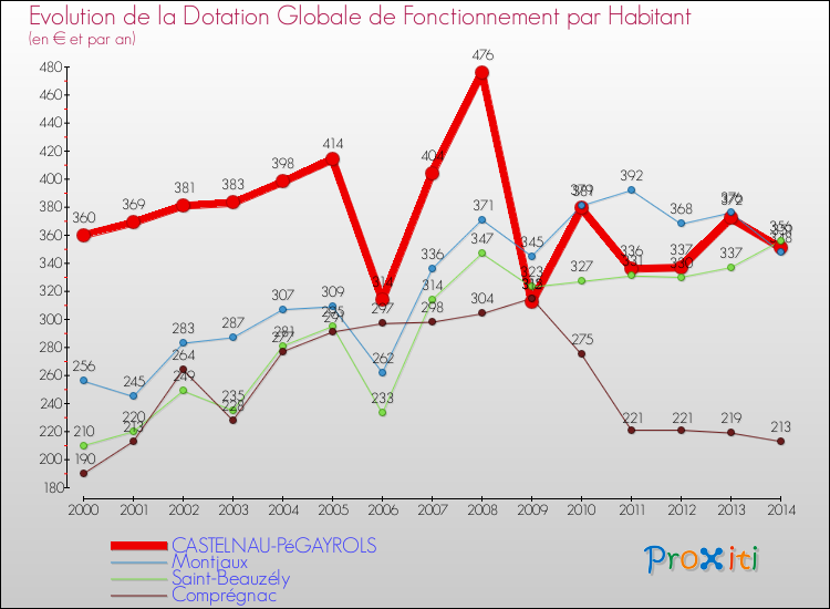 Dans le même temps, la Dotation Globale de Fonctionnement accordée aux communes françaises similaires à Castelnau-Pégayrols était de 199 € par habitant, en 2014.