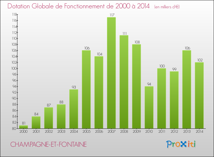 En effet, la dotation globale de fonctionnement versée par l'état en 2014 à la seule commune de Champagne-et-Fontaine était de : 102 000 € au total.