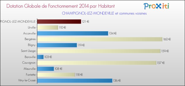 Le graphique ci dessous indique la Dotation Globale de Fonctionnement accordée par habitant à Champignol-lez-Mondeville en 2014 par rapport aux communes voisines.