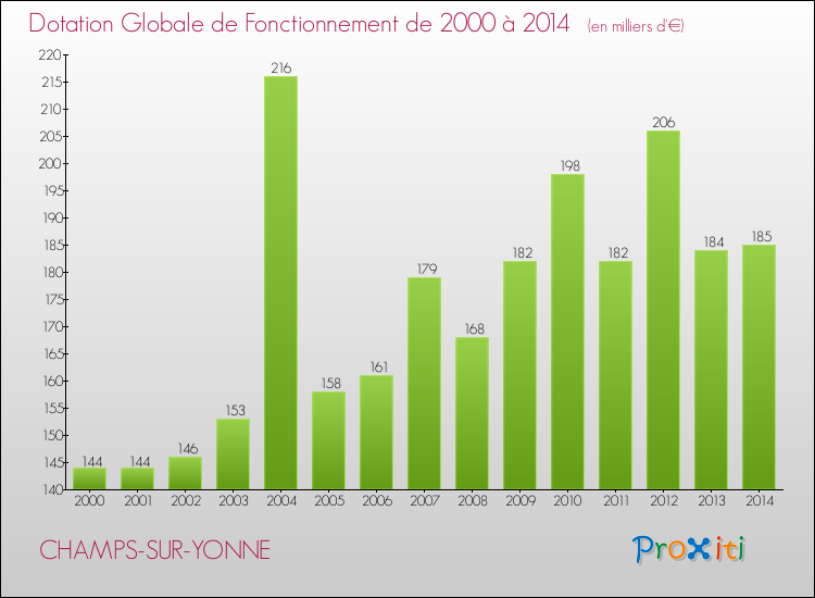 Dans le même temps, la Dotation Globale de Fonctionnement accordée aux communes françaises similaires à Champs-sur-Yonne était de 171 € par habitant, en 2014.
