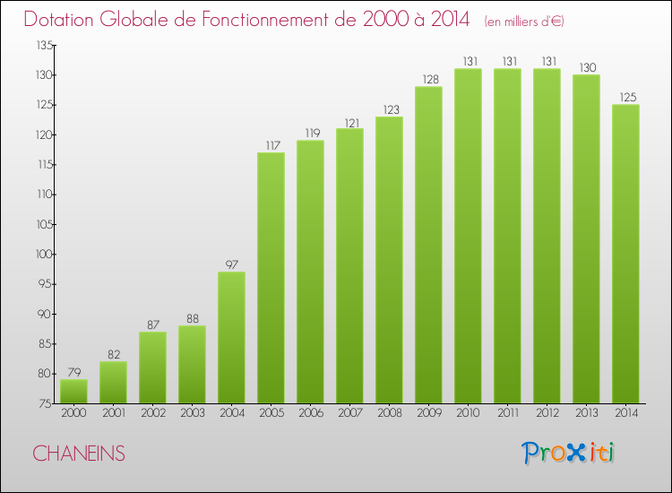 Dans le même temps, la Dotation Globale de Fonctionnement accordée aux communes françaises similaires à Chaneins était de 216 € par habitant, en 2014.