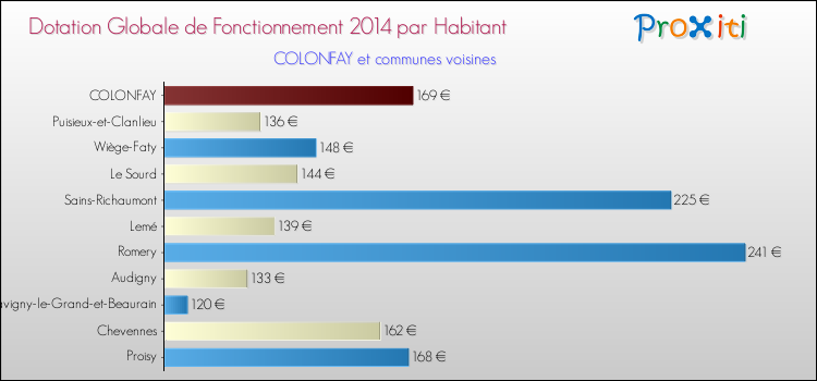 Le graphique ci dessous indique la Dotation Globale de Fonctionnement accordée par habitant à Colonfay en 2014 par rapport aux communes voisines.