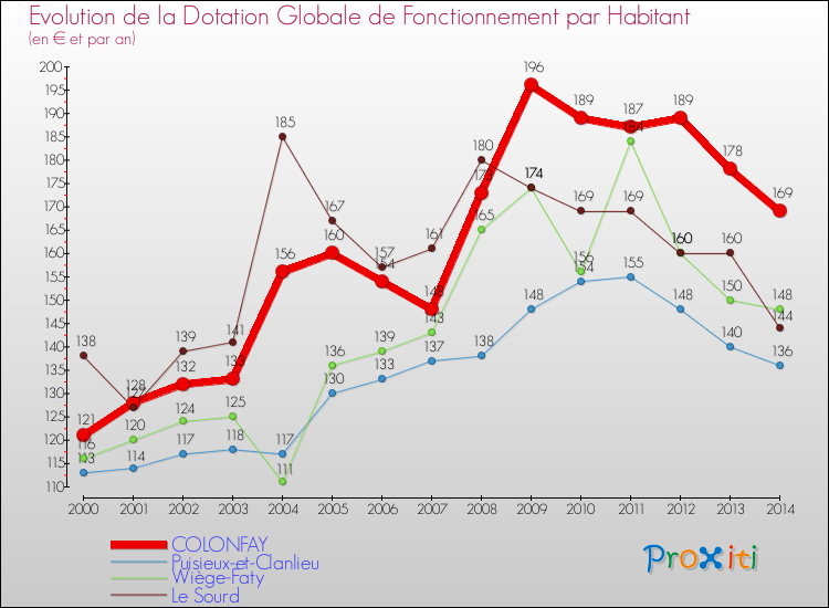 Dans le même temps, la Dotation Globale de Fonctionnement accordée aux communes françaises similaires à Colonfay était de 226 € par habitant, en 2014.