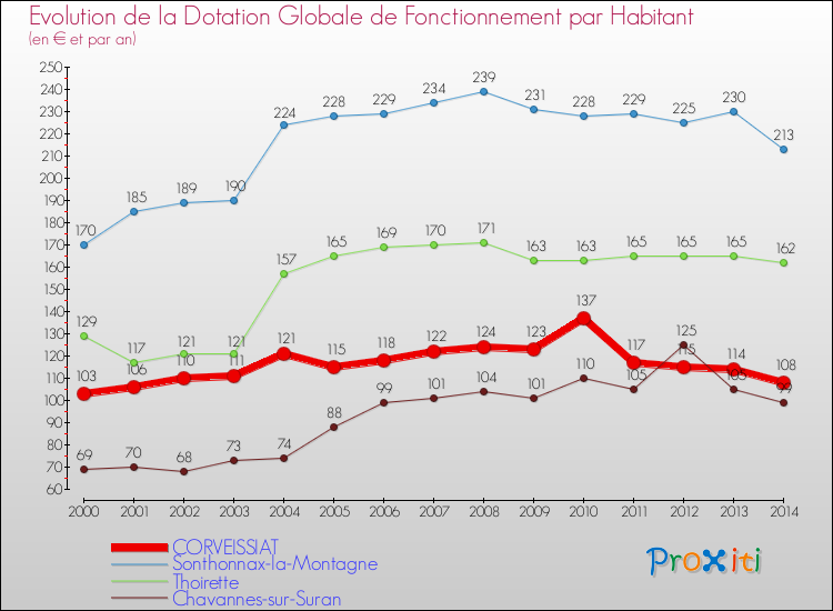Dans le même temps, la Dotation Globale de Fonctionnement accordée aux communes françaises similaires à Corveissiat était de 171 € par habitant, en 2014.
