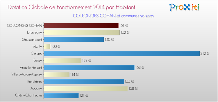 Le graphique ci dessous indique la Dotation Globale de Fonctionnement accordée par habitant à Coulonges-Cohan en 2014 par rapport aux communes voisines.