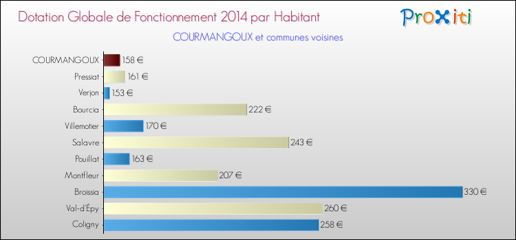 Le graphique ci dessous indique la Dotation Globale de Fonctionnement accordée par habitant à Courmangoux en 2014 par rapport aux communes voisines.