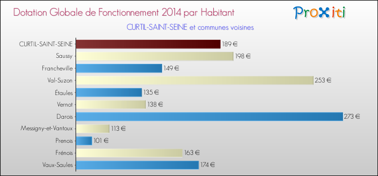 Le graphique ci dessous indique la Dotation Globale de Fonctionnement accordée par habitant à Curtil-Saint-Seine en 2014 par rapport aux communes voisines.