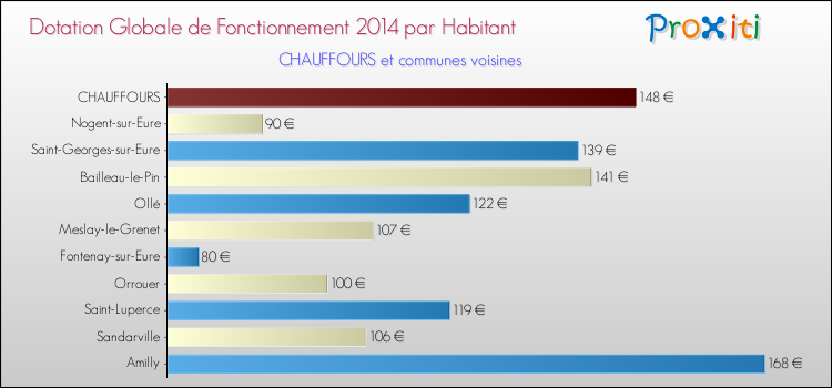 Le graphique ci dessous indique la Dotation Globale de Fonctionnement accordée par habitant à Chauffours en 2014 par rapport aux communes voisines.