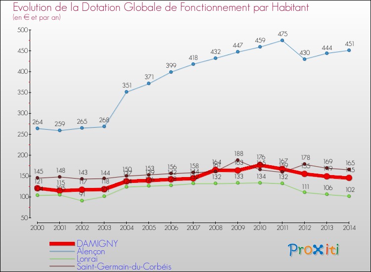 Dans le même temps, la Dotation Globale de Fonctionnement accordée aux communes françaises similaires à Damigny était de 177 € par habitant, en 2014.