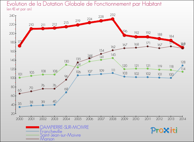 Dans le même temps, la Dotation Globale de Fonctionnement accordée aux communes françaises similaires à Dampierre-sur-Moivre était de 230 € par habitant, en 2014.