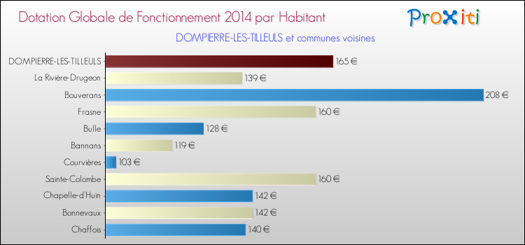 Le graphique ci dessous indique la Dotation Globale de Fonctionnement accordée par habitant à Dompierre-les-Tilleuls en 2014 par rapport aux communes voisines.