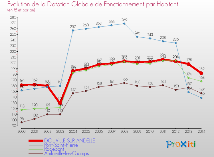 Dans le même temps, la Dotation Globale de Fonctionnement accordée aux communes françaises similaires à Douville-sur-Andelle était de 176 € par habitant, en 2014.