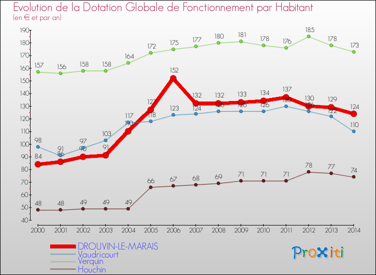 Dans le même temps, la Dotation Globale de Fonctionnement accordée aux communes françaises similaires à Drouvin-le-Marais était de 171 € par habitant, en 2014.