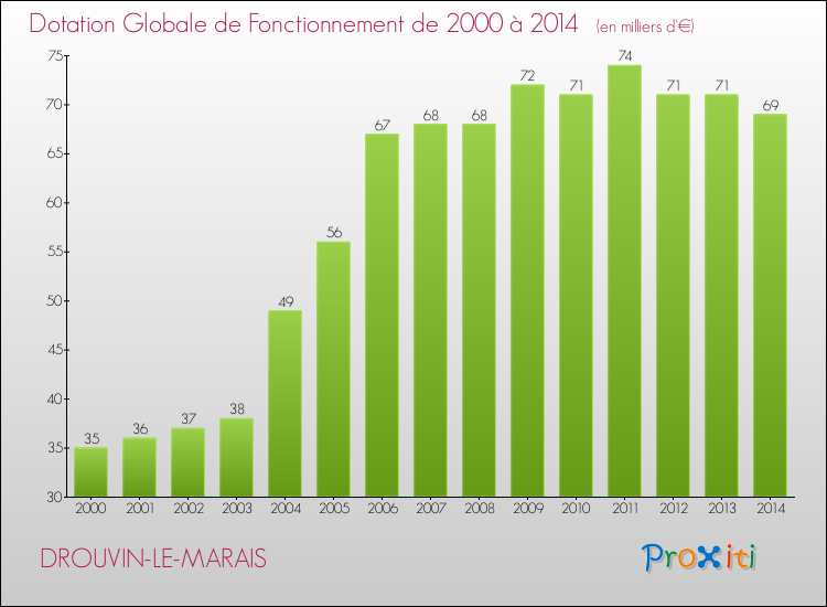 En effet, la dotation globale de fonctionnement versée par l'état en 2014 à la seule commune de Drouvin-le-Marais était de : 69 000 € au total.