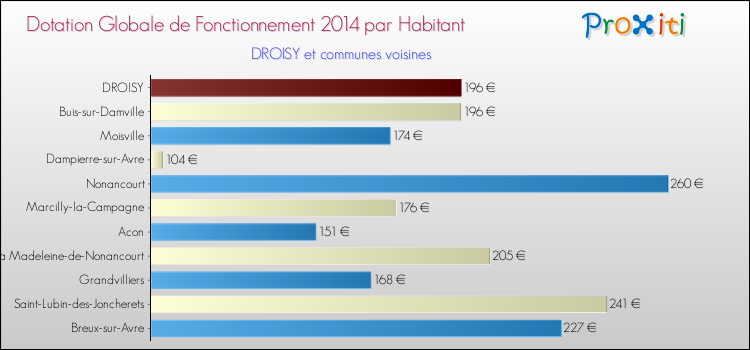 Le graphique ci dessous indique la Dotation Globale de Fonctionnement accordée par habitant à Droisy en 2014 par rapport aux communes voisines.