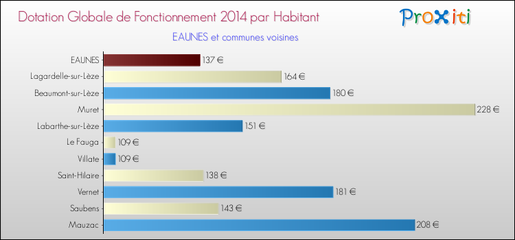 Le graphique ci dessous indique la Dotation Globale de Fonctionnement accordée par habitant à Eaunes en 2014 par rapport aux communes voisines.
