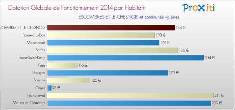 Le graphique ci dessous indique la Dotation Globale de Fonctionnement accordée par habitant à Escombres-et-le-Chesnois en 2014 par rapport aux communes voisines.