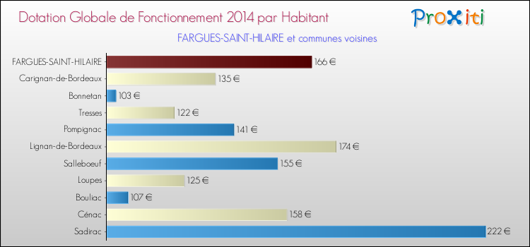 Le graphique ci dessous indique la Dotation Globale de Fonctionnement accordée par habitant à Fargues-Saint-Hilaire en 2014 par rapport aux communes voisines.