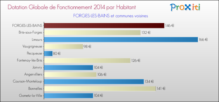 Le graphique ci dessous indique la Dotation Globale de Fonctionnement accordée par habitant à Forges-les-Bains en 2014 par rapport aux communes voisines.