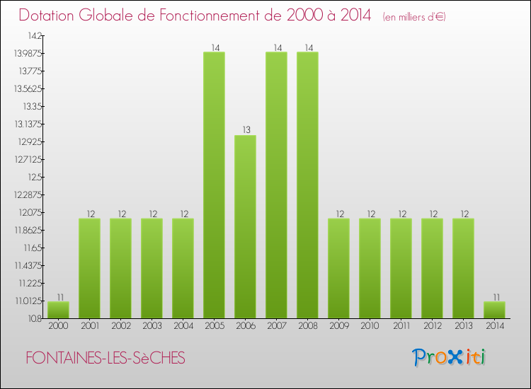 Dans le même temps, la Dotation Globale de Fonctionnement accordée aux communes françaises similaires à Fontaines-les-Sèches était de 230 € par habitant, en 2014.
