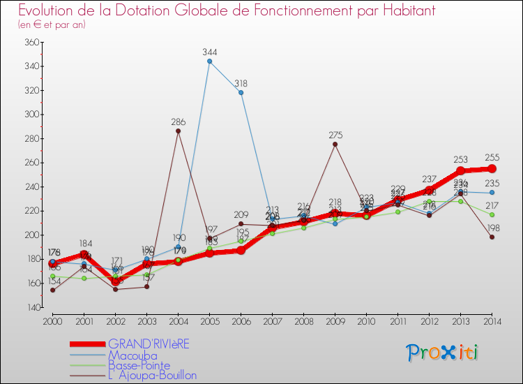 Dans le même temps, la Dotation Globale de Fonctionnement accordée aux communes françaises similaires à Grand'Rivière était de 171 € par habitant, en 2014.