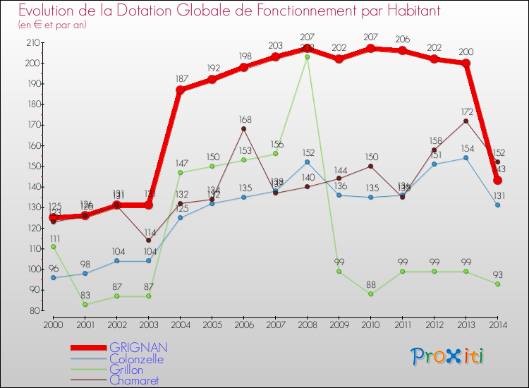 Dans le même temps, la Dotation Globale de Fonctionnement accordée aux communes françaises similaires à Grignan était de 171 € par habitant, en 2014.
