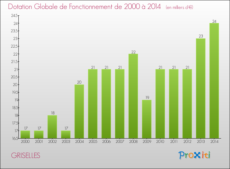 Dans le même temps, la Dotation Globale de Fonctionnement accordée aux communes françaises similaires à Griselles était de 230 € par habitant, en 2014.