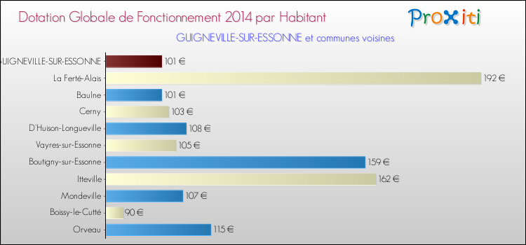 Le graphique ci dessous indique la Dotation Globale de Fonctionnement accordée par habitant à Guigneville-sur-Essonne en 2014 par rapport aux communes voisines.